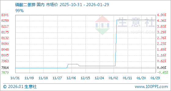 1月29日,生意社磷酸二氢钾基准价为8266.67元/吨,与本月初(7928.57元/吨)相比,上涨了4.26%。