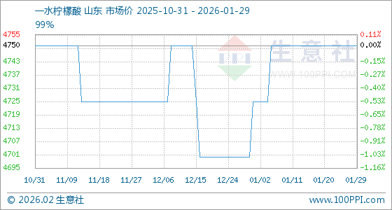 1月29日,生意社一水柠檬酸基准价为4750.00元/吨,与本月初(4725.00元/吨)相比,上涨了0.53%。