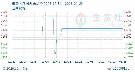 1月29日,生意社氢氧化钾基准价为7033.33元/吨,与本月初持平。