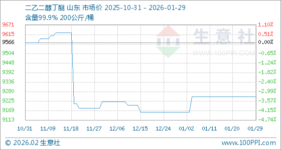 1月29日,生意社二乙二醇丁醚基准价为9250.00元/吨,与本月初(9160.00元/吨)相比,上涨了0.98%。