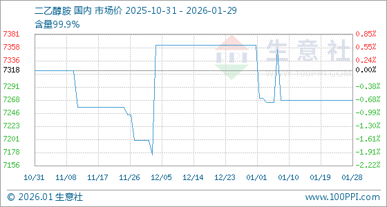 1月29日,生意社二乙醇胺基准价为7268.75元/吨,与本月初(7362.50元/吨)相比,下降了1.27%。