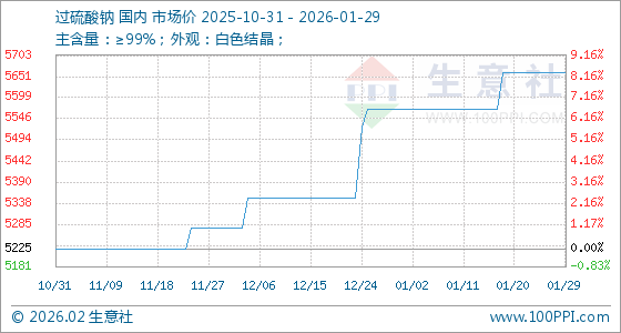 1月29日,生意社过硫酸钠基准价为5660.00元/吨,与本月初(5570.00元/吨)相比,上涨了1.62%。