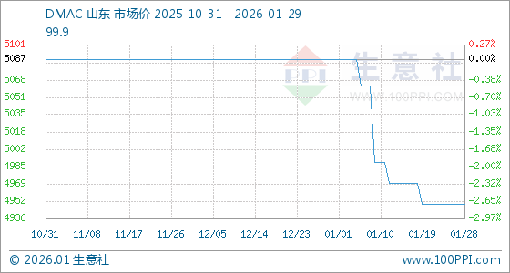 1月29日,生意社DMAC基准价为4950.00元/吨,与本月初(5087.50元/吨)相比,下降了2.7%。