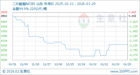 1月29日,生意社二价酸酯MDBE基准价为6300.00元/吨,与本月初(6216.67元/吨)相比,上涨了1.34%。