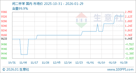 1月29日,生意社间二甲苯基准价为9333.33元/吨,与本月初(9200.00元/吨)相比,上涨了1.45%。