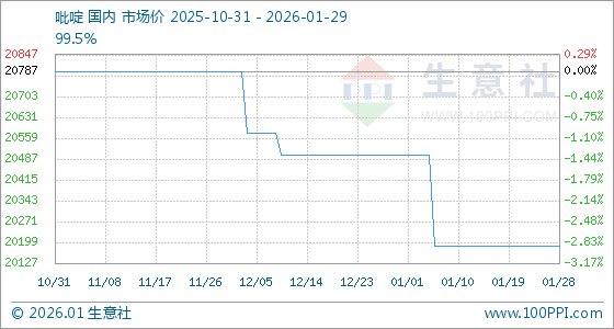1月29日,生意社吡啶基准价为20187.50元/吨,与本月初(20500.00元/吨)相比,下降了1.52%。