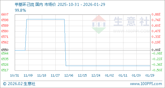 1月29日,生意社甲基环己烷基准价为6525.00元/吨,与本月初持平。