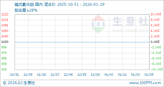 1月29日,生意社碱式氯化铝基准价为1020.00元/吨,与本月初持平。