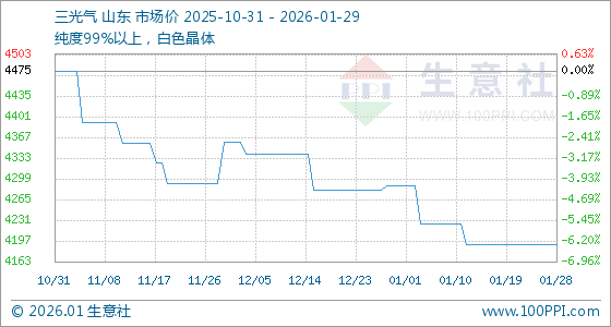 1月29日,生意社三光气基准价为4191.67元/吨,与本月初(4287.50元/吨)相比,下降了2.24%。