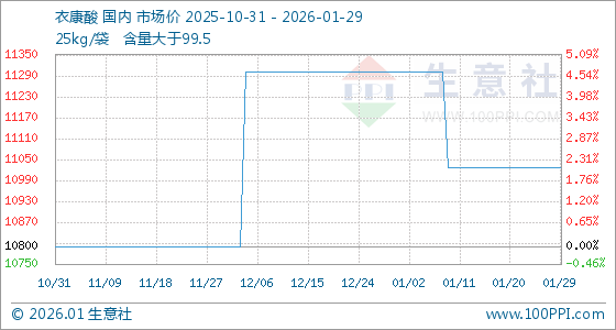 1月29日,生意社衣康酸基准价为11025.00元/吨,与本月初(11300.00元/吨)相比,下降了2.43%。