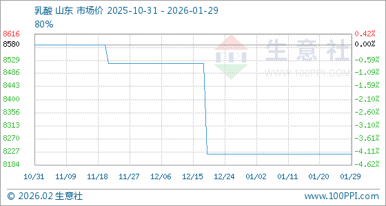 1月29日,生意社乳酸基准价为8220.00元/吨,与本月初持平。