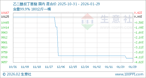 1月29日,生意社乙二醇叔丁基醚基准价为9700.00元/吨,与本月初(9725.00元/吨)相比,下降了0.26%。