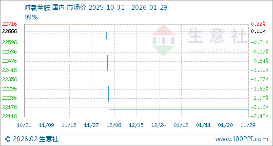 1月29日,生意社对氯苯胺基准价为22166.67元/吨,与本月初持平。