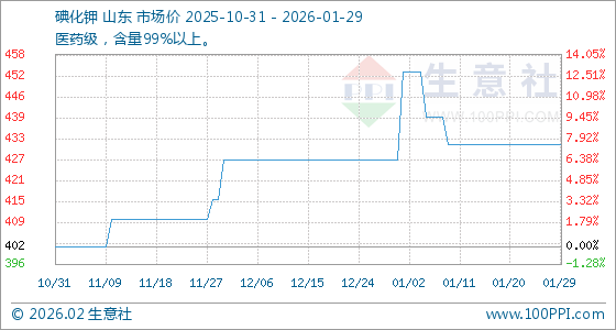 1月29日,生意社碘化钾基准价为432.00元/公斤,与本月初(427.50元/公斤)相比,上涨了1.05%。