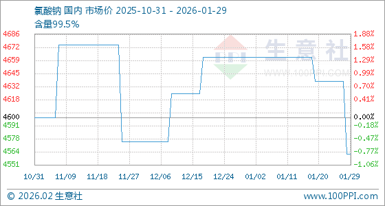 1月29日,生意社氯酸钠基准价为4562.50元/吨,与本月初(4662.50元/吨)相比,下降了2.14%。