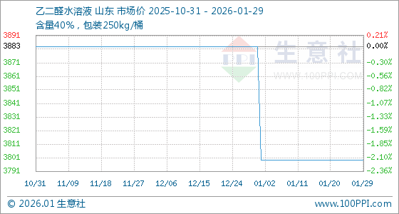 1月29日,生意社乙二醛水溶液基准价为3800.00元/吨,与本月初(3883.33元/吨)相比,下降了2.15%。