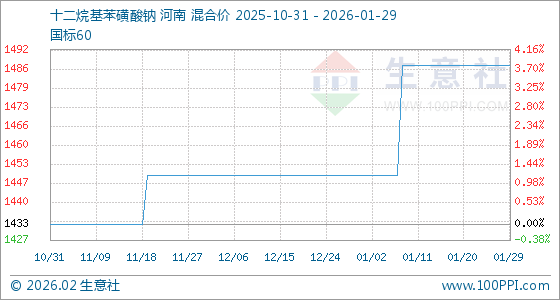 1月29日,生意社十二烷基苯磺酸钠基准价为1487.50元/吨,与本月初(1450.00元/吨)相比,上涨了2.59%。