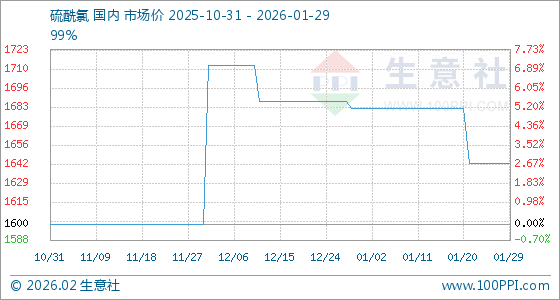 1月29日,生意社硫酰氯基准价为1643.33元/吨,与本月初(1682.50元/吨)相比,下降了2.33%。