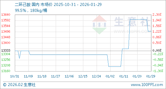 1月29日,生意社二环己胺基准价为13500.00元/吨,与本月初(13300.00元/吨)相比,上涨了1.50%。