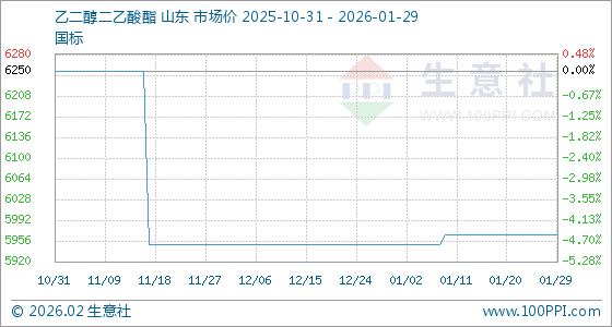 1月29日,生意社乙二醇二乙酸酯基准价为5966.67元/吨,与本月初(5950.00元/吨)相比,上涨了0.28%。