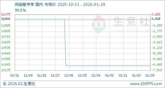 1月29日,生意社间硝基甲苯基准价为10250.00元/吨,与本月初持平。