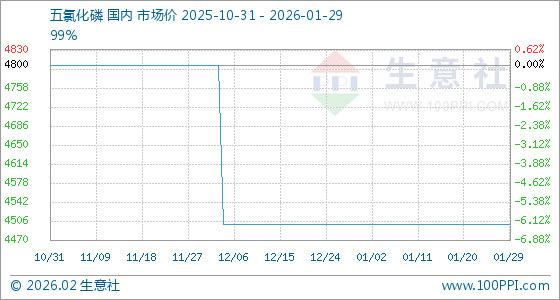 1月29日,生意社五氯化磷基准价为4500.00元/吨,与本月初持平。