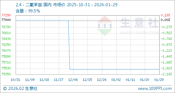 1月29日,生意社2,4-二氯苯胺基准价为75500.00元/吨,与本月初持平。