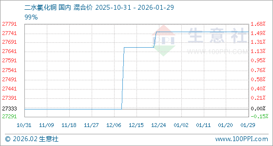 1月29日,生意社二水氯化铜基准价为27750.00元/吨,与本月初持平。