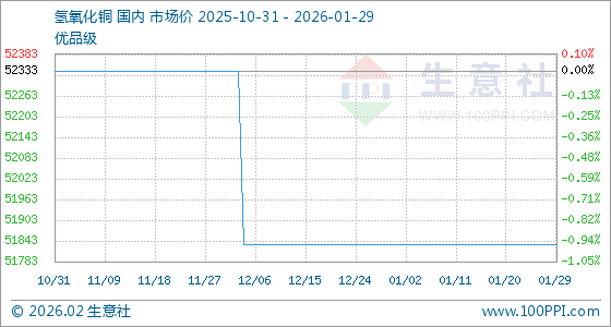 1月29日,生意社氢氧化铜基准价为51833.33元/吨,与本月初持平。