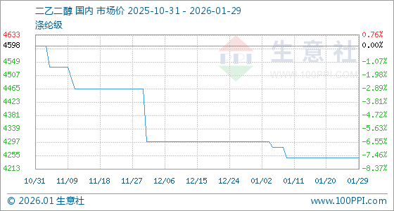 1月29日,生意社二乙二醇基准价为4248.33吨,与本月初(4298.33吨)相比,下降了1.16%。