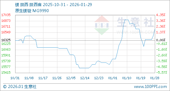 1月29日,生意社镁基准价为16650.00元/吨,与本月初(15725.00元/吨)相比,上涨了5.88%。