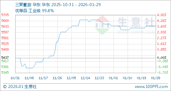 1月29日,生意社三聚氰胺基准价为5637.50元/吨,与本月初持平。
