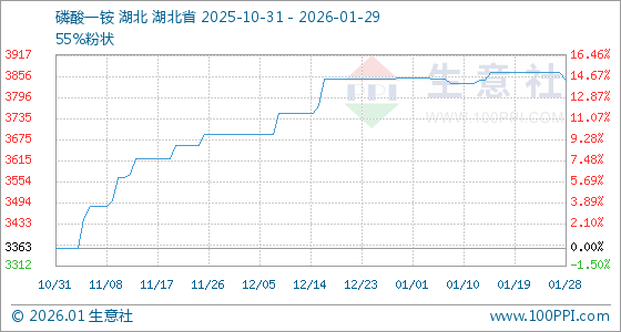 1月29日,生意社磷酸一铵基准价为3846.67元/吨,与本月初(3853.33元/吨)相比,下降了0.17%。
