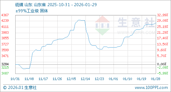1月29日,生意社硫磺基准价为4203.33元/吨,与本月初(3661.00元/吨)相比,上涨了14.81%。