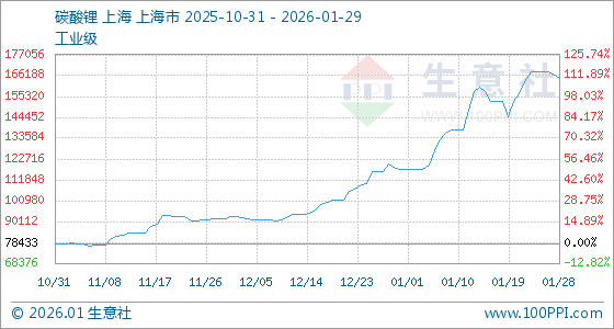 1月29日,生意社碳酸锂(工业级)基准价为165000.00元/吨,与本月初(117033.33元/吨)相比,上涨了40.99%。