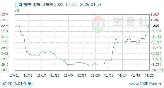 1月29日,生意社沥青基准价为3273.33元/吨,与本月初(2973.33元/吨)相比,上涨了10.09%。