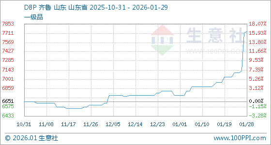 1月29日,生意社DBP基准价为7735.00元/吨,与本月初(6751.67元/吨)相比,上涨了14.56%。