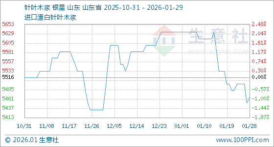 1月29日,生意社针叶木浆基准价为5466.67元/吨,与本月初(5633.33元/吨)相比,下降了2.96%。