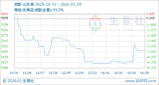 1月29日,生意社顺酐基准价为5187.50元/吨,与本月初(5112.50元/吨)相比,上涨了1.47%。