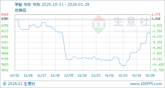 1月29日,生意社苯酚基准价为6150.00元/吨,与本月初(5750.00元/吨)相比,上涨了6.96%。