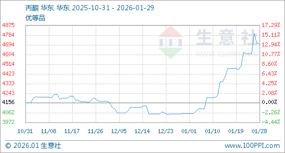 1月29日,生意社丙酮基准价为4700.00元/吨,与本月初(4057.50元/吨)相比,上涨了15.83%。