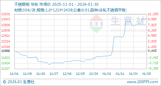 1月30日,生意社不锈钢板基准价为13036.67元/吨,与本月初(11691.67元/吨)相比,上涨了11.50%。