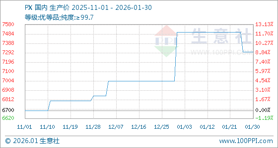 1月30日,生意社PX基准价为7300.00元/吨,与本月初(7500.00元/吨)相比,下降了2.67%。