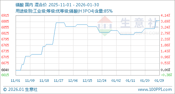 1月30日,生意社磷酸基准价为6890.00元/吨,与本月初(6840.00元/吨)相比,上涨了0.73%。