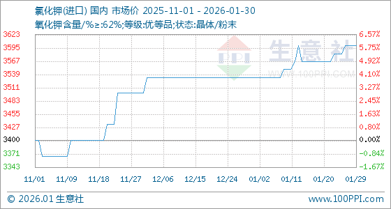 1月30日,生意社氯化钾(进口)基准价为3600.00元/吨,与本月初(3533.33元/吨)相比,上涨了1.89%。
