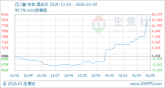 1月30日,生意社己二酸基准价为7900.00元/吨,与本月初(7133.33元/吨)相比,上涨了10.75%。