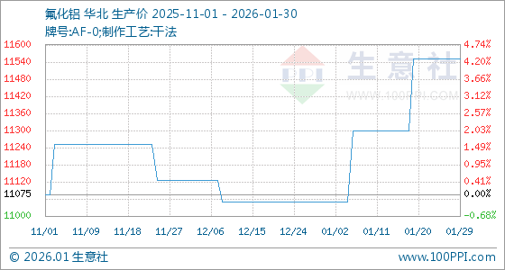 1月30日,生意社氟化铝基准价为11550.00元/吨,与本月初(11050.00元/吨)相比,上涨了4.52%。