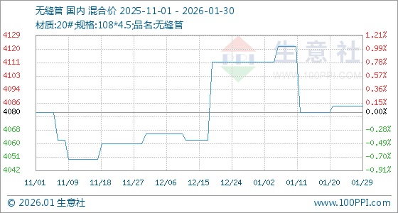 1月30日,生意社无缝管基准价为4084.00元/吨,与本月初(4112.00元/吨)相比,下降了0.68%。