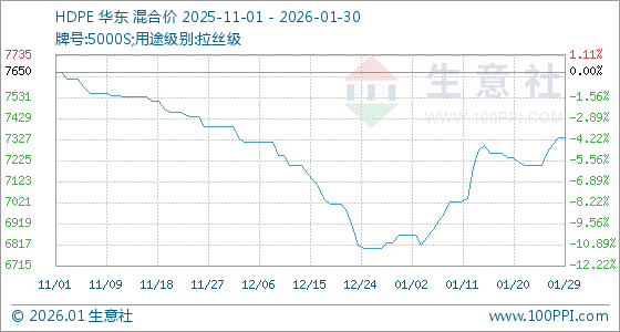 1月30日,生意社HDPE基准价为7337.50元/吨,与本月初(6862.50元/吨)相比,上涨了6.92%。
