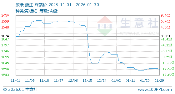 1月30日,生意社废纸基准价为1594.00元/吨,与本月初(1720.00元/吨)相比,下降了7.33%。